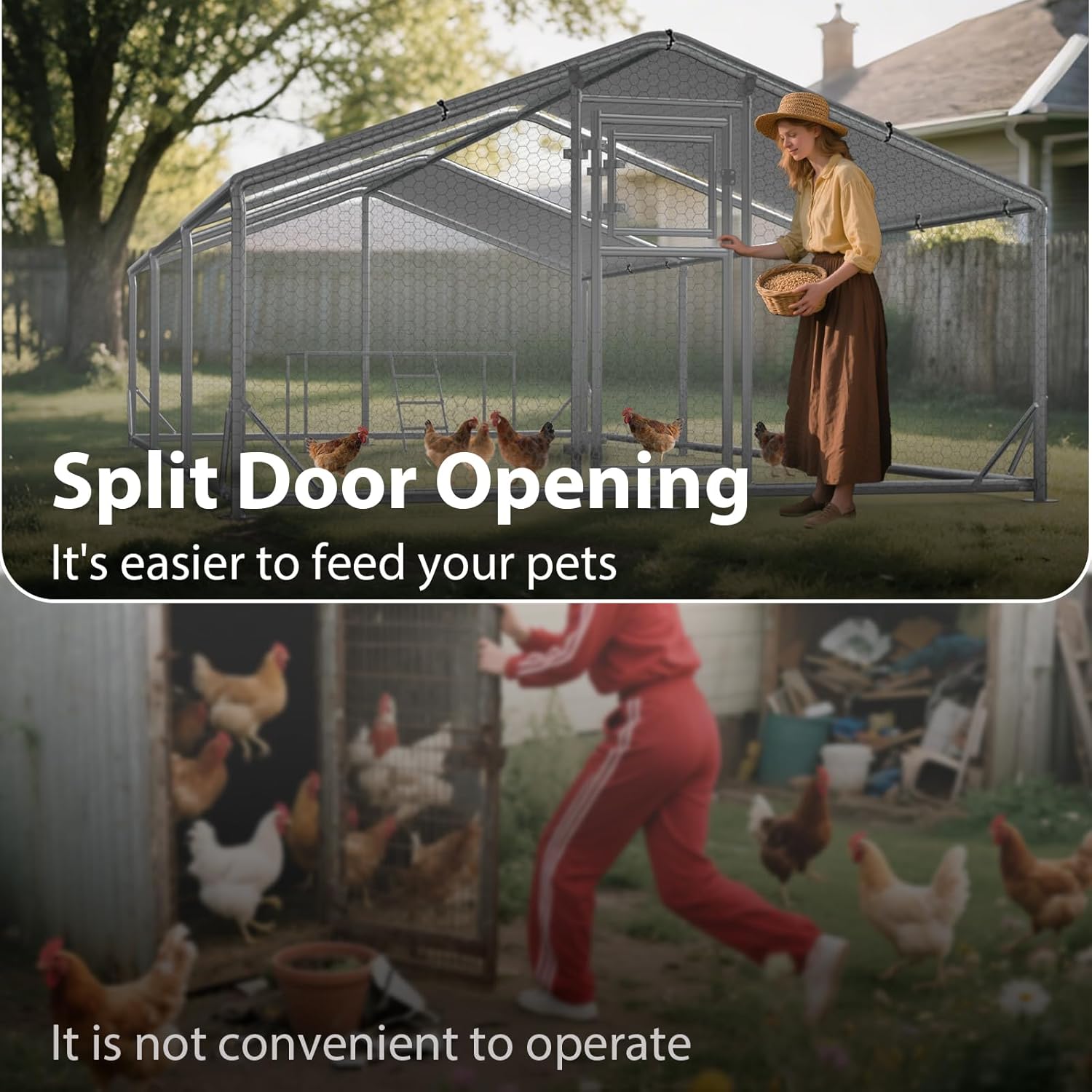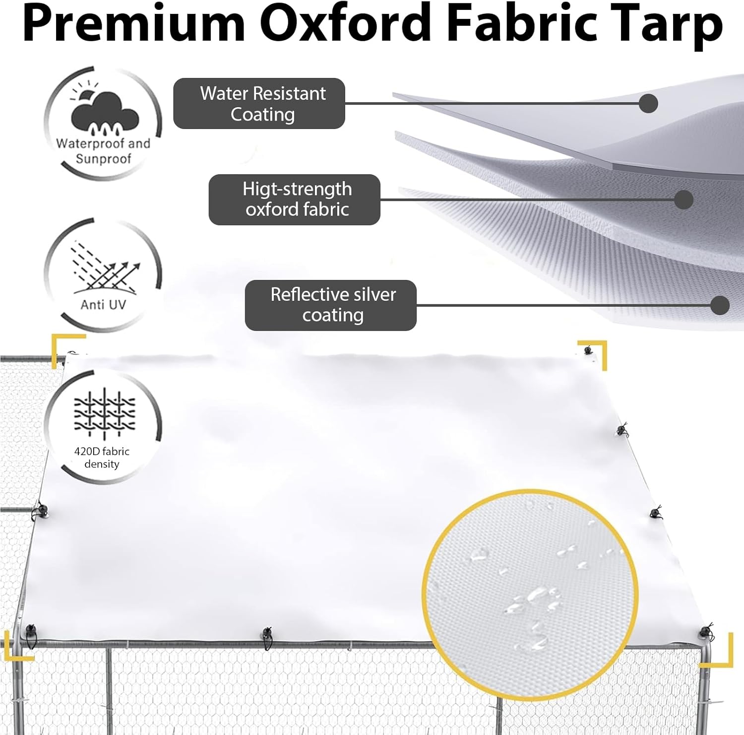 Multi-Layer Weather Protection:This metal chicken coop is built with an all-weather dual-layer roof system, combining a waterproof polymer coating, durable 420D Oxford fabric, and a reflective silver layer. Reinforced with a rust-resistant steel frame and hexagonal wire mesh, it performs reliably in heavy rain, strong winds, and intense sun. Designed for long-term outdoor use, it offers stable protection and a safe year-round habitat for your flock.