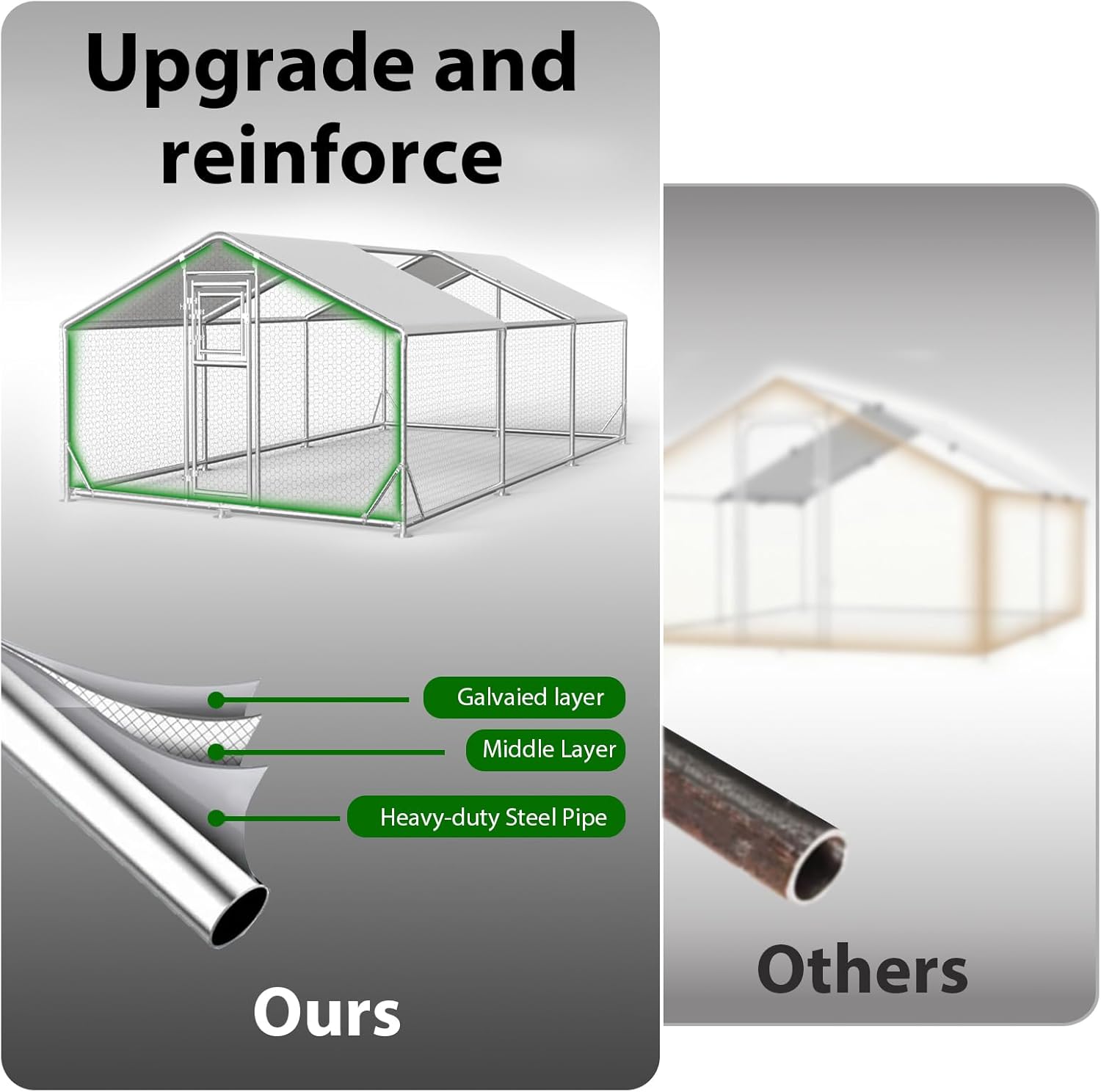 Ultra-Durable & Stable Chicken Coop:Crafted with a triple-layer anti-rust metal structure and 8mm thick galvanized steel pipes, this walk-in metal chicken coop offers exceptional stability. Reinforced at the base, corners, and rear support posts, it’s built to withstand predator threats and ensure reliable performance through years of outdoor use.