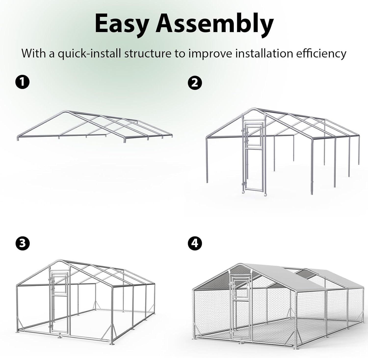 Quick & Hassle-Free Assembly:All parts come pre-drilled and clearly labeled, with step-by-step visual instructions. This walk-in chicken coop can be easily assembled by two people in a short amount of time—no construction experience required. Simply unfold, connect, and secure. It’s the perfect solution for backyard poultry keeping, small farms, or sustainable living setups.